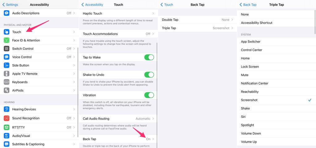 In the Settings app, go to Accessibility > Touch > Back Tap and choose one of two options: double tap or triple tap. You should see a list of actions you can run by tapping the back of your iPhone, like opening your camera, turning on the flashlight and scrolling up and down. Tap an action or shortcut to enable it with Back Tap.