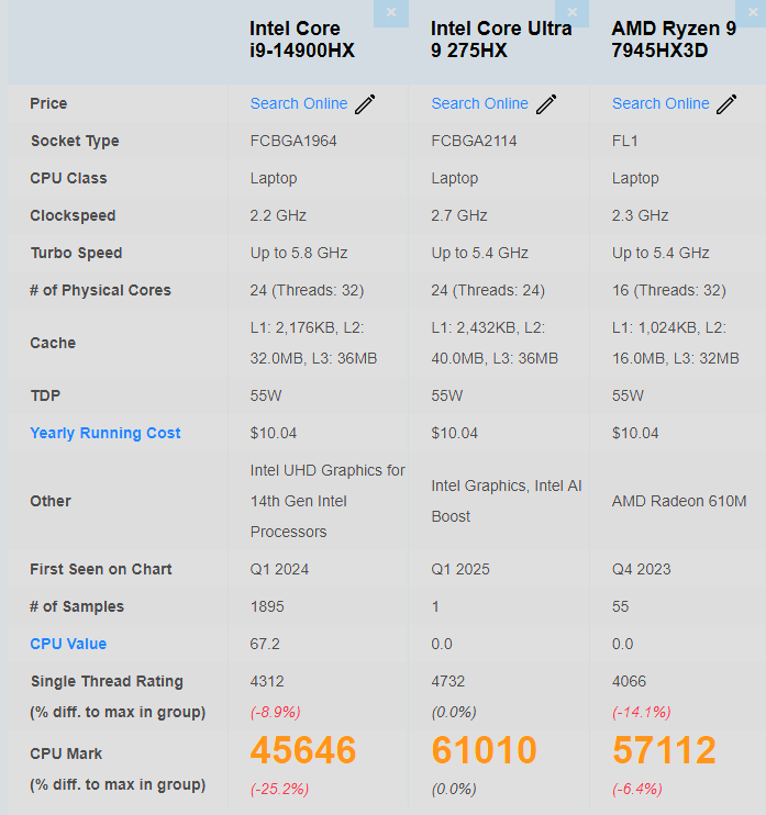 In the single-threaded benchmark at PassMark, the 275HX leads the pack; up to 16% faster than the Ryzen 9 7945HX3D. This is not an exact apples-to-apples comparison as AMD's new Zen 5-based Fire Range chips are just around the corner, so we aren't sure if Intel can maintain its performance throne for long. In any case, this lead extends to 34% against the i9-14900HX in CPU Mark; PassMark's proprietary tool for estimating a CPU's performance. Despite a near 7% reduction in boost clocks, the Arrow Lake chip still lands roughly 9% ahead in terms of single-core performance.