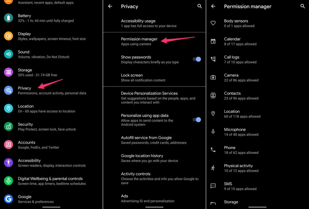 Open the Settings app then tap Privacy > Permissions Manager. Go through each category to see which apps currently have access to which treasure trove of your personal data. Find an app you don't want to have access to your location? Turn it off. The same goes for contacts, calendar or camera.