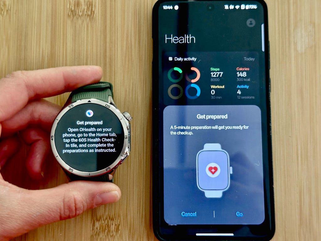 Here's the OnePlus Watch 3 next to a OnePlus 13 with the OHealth app open. Vanessa Hand Orellana/CNET