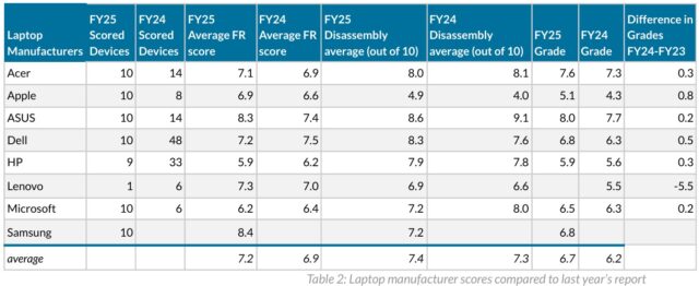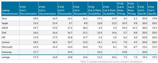 “HP laptops, which decreased in repairability from 2023 to 2024, hardly improved at all this year. Repairability improvements in Lenovo and Asus laptops have been slow and inconsistent over the past few years,” the report says.