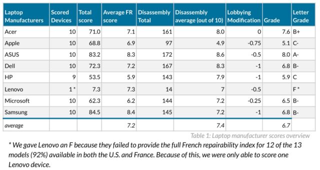 US PIRG's analysis included finding each device's French Repairability Index scores on PC makers' French websites and on third-party retailer sites. US PIRG calculated PC makers' grades by averaging "the total French score and the isolated disassembly score from each device." It weighed disassembly scores more heavily because it believes "this better reflects what consumers think a repairability score indicates." Next, the group subtracted half a point each for membership in TechNet or the Consumer Technology Association (CTA), industry groups that oppose right-to-repair legislation, and added a quarter point "for each piece of Right to Repair legislation supported by the testimony of the manufacturer in the last year."