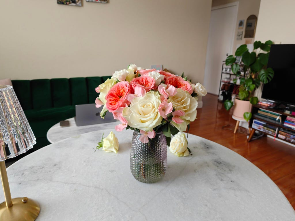 Edges aren't very sharp in this portrait mode shot, but at least the roses in the foreground are in punchy focus. Abrar Al-Heeti/CNET