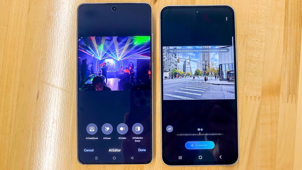 AI Image Enhance features on the OnePlus 13R and Samsung Galaxy S24 FE. Mike Sorrentino/CNET