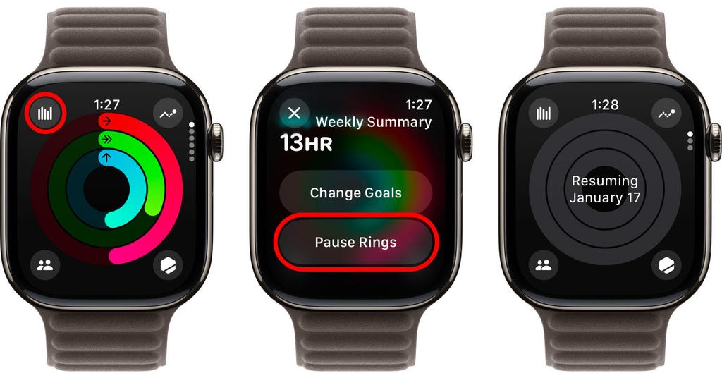 Now, the watch is more forgiving (and practical), letting you pause your rings without disrupting the streak. Open the Activity app and tap the Weekly Summary button in the top-left corner. Scroll all the way to the bottom (take a moment to admire your progress) and tap the Pause Rings button. You can choose to pause them for today, until next week or month, or set a custom number of days.