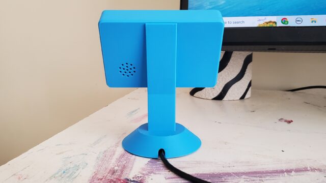 The back of the DeskBuddy, where you can see the speaker. The screen isn't adjustable.