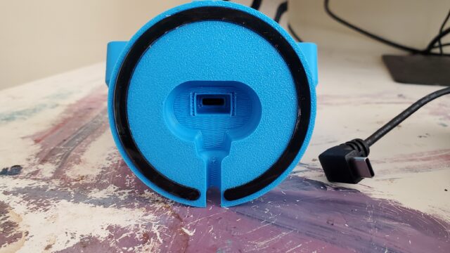 The display is in a plastic case with parallel lines surrounding the USB-C port that give away its 3D-printed origin.