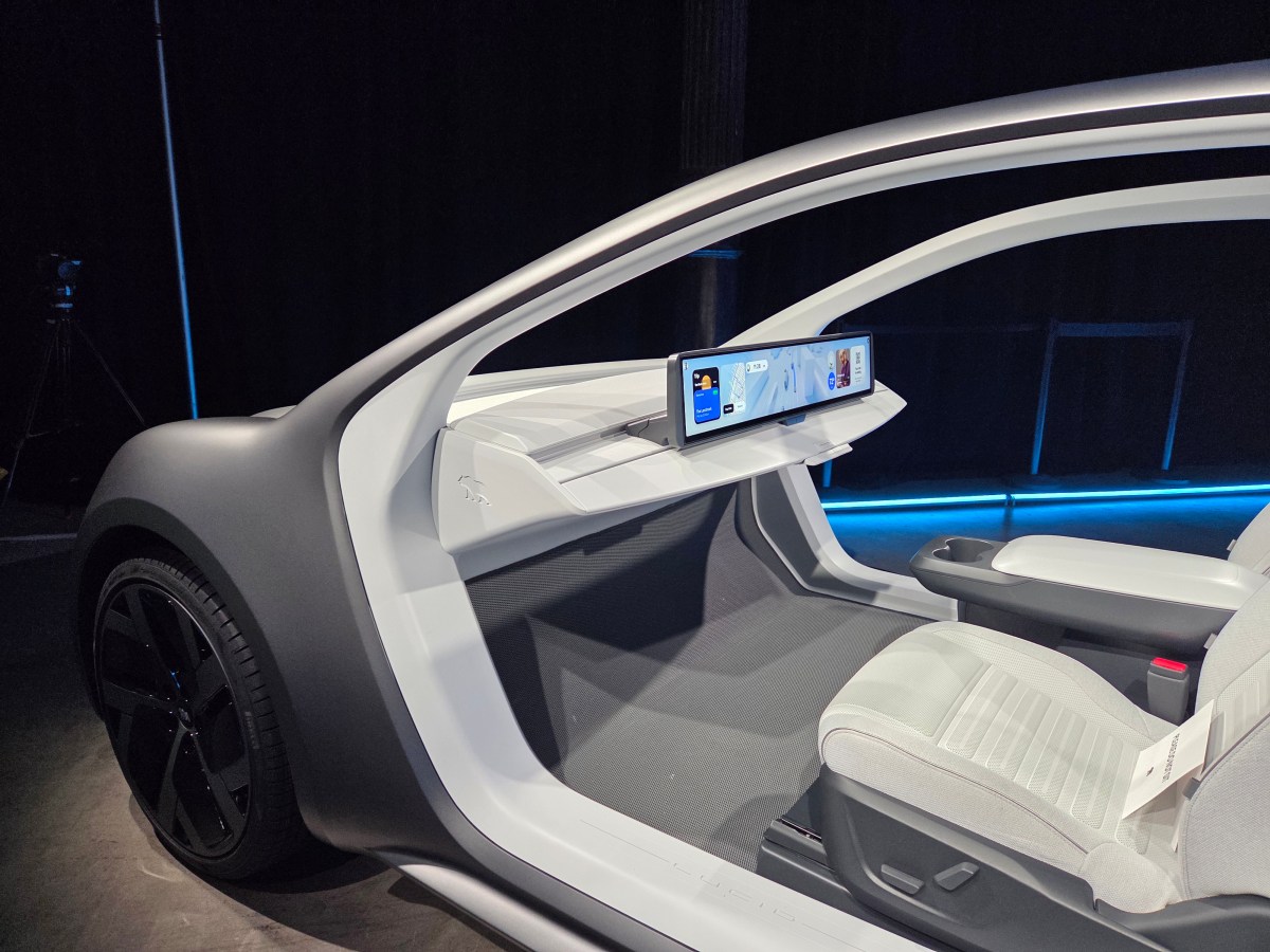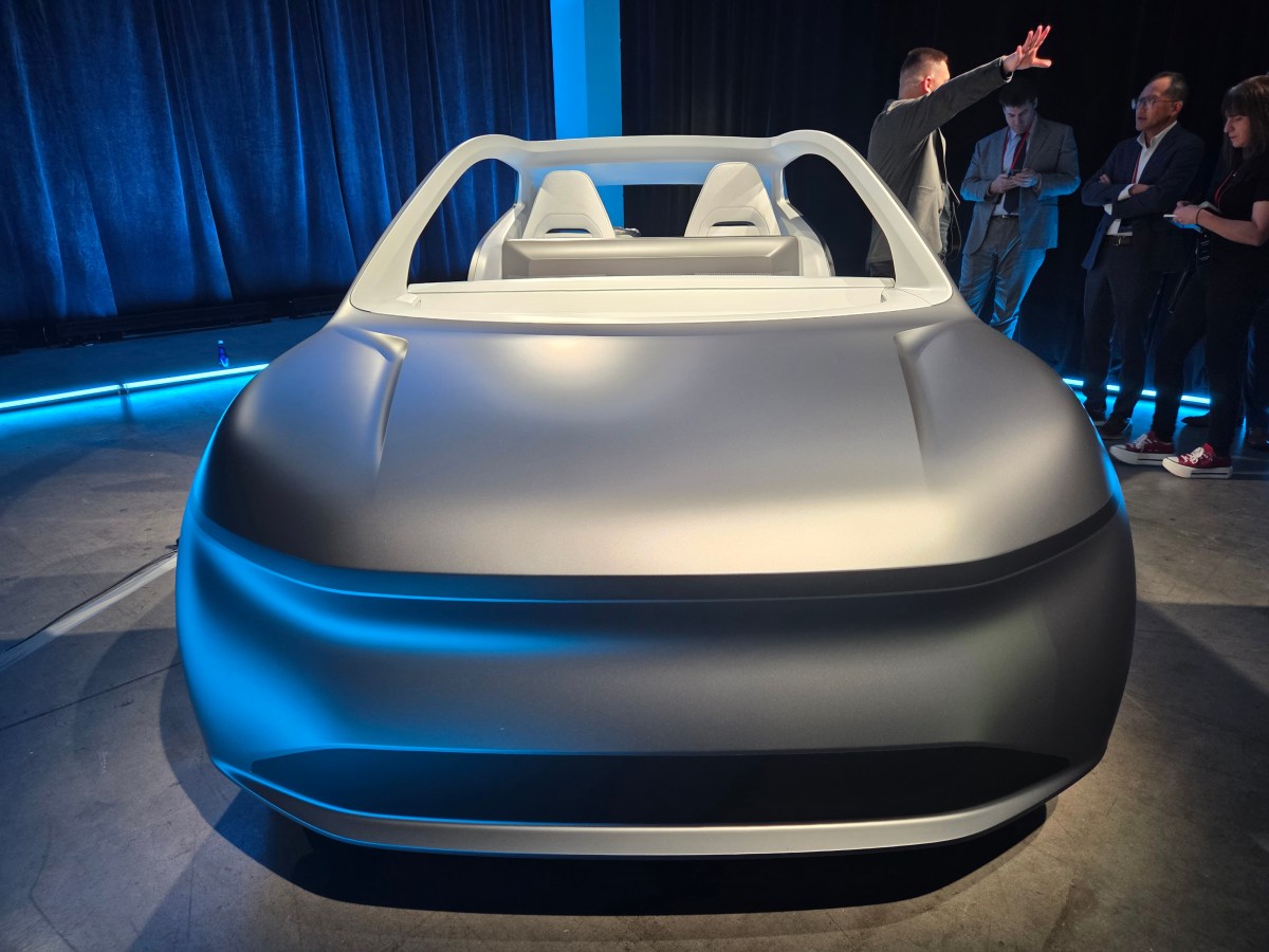 Then, in a “just one more thing” moment, Lucid’s acting CEO Marc Winterhoff revealed a concept car hidden behind a curtain at one end of the hall. The two-seat robotaxi concept, dubbed the Lucid Lunar, was displayed without doors to show off its interior space and large luggage bay. Visions of the Tesla Cybercab, different but the same, flashed through my mind.