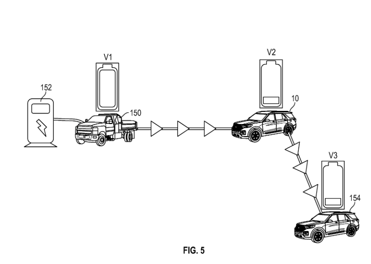 That second port could be used to charge another battery, including the battery of another EV, and the patent includes an illustration of three EVs daisy-chained to each other.